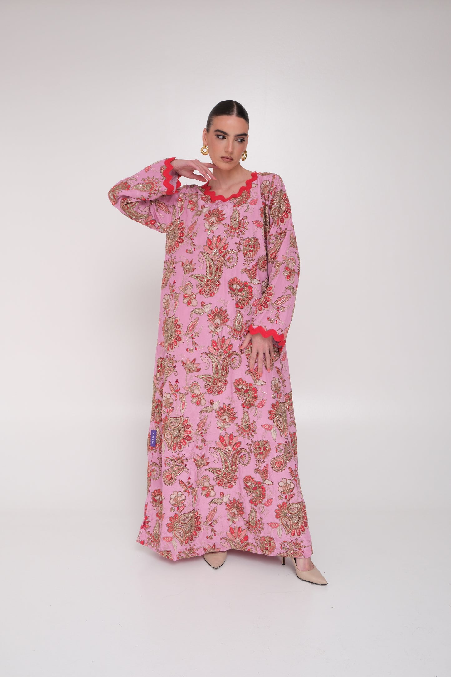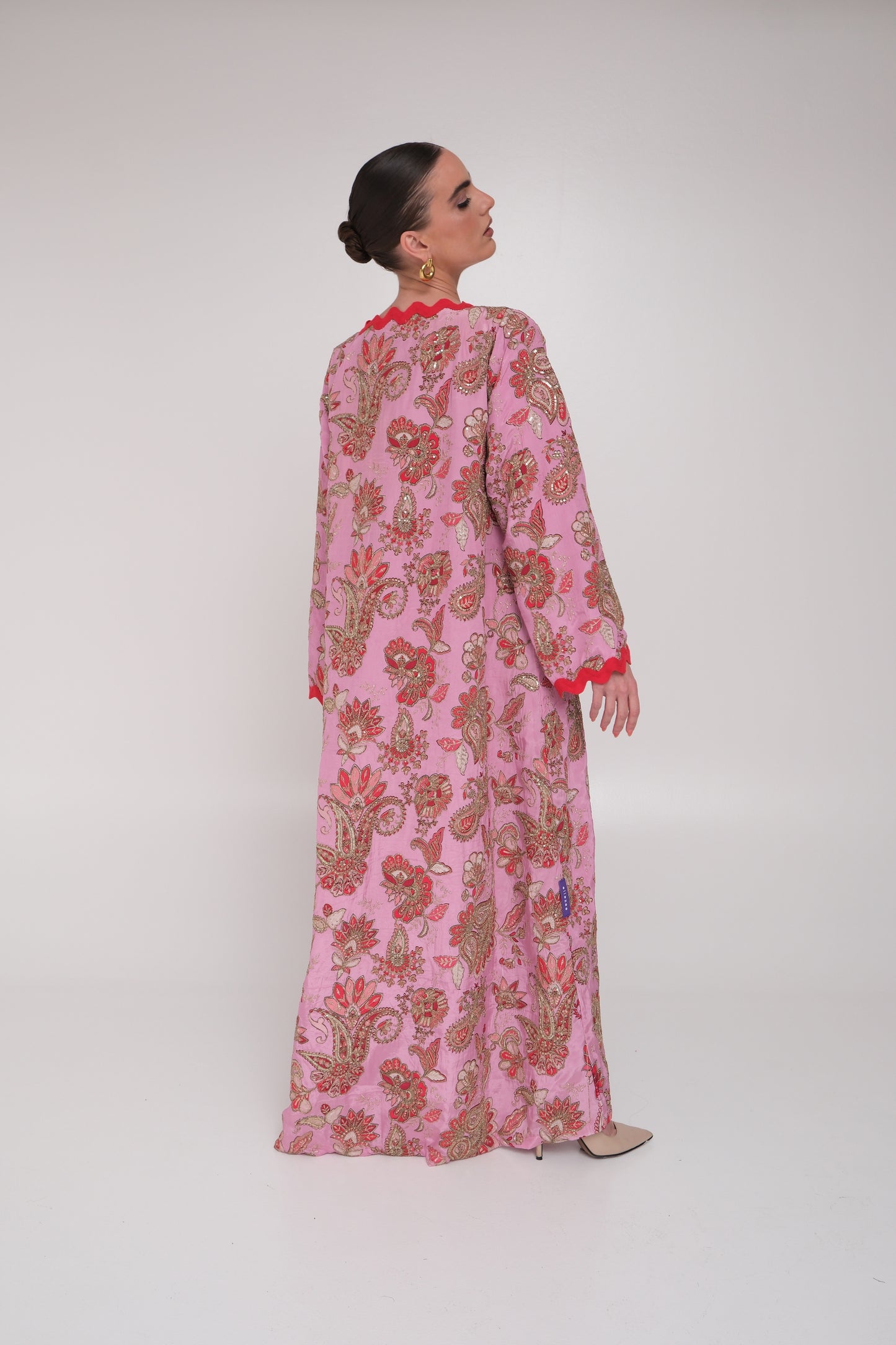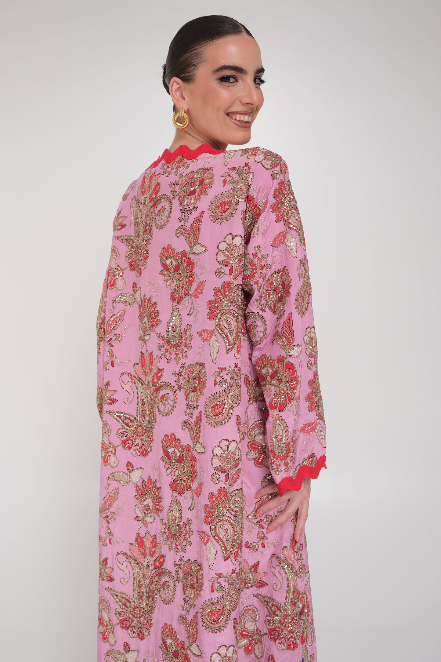 Designed in a bright pink embroidered fabric, this kaftan features intricate detailing accented with a bold pop of red. Finished with a wave-shaped neckline and matching wave detailing on the sleeves, bringing a. striking yet balanced statement to the silhouette.