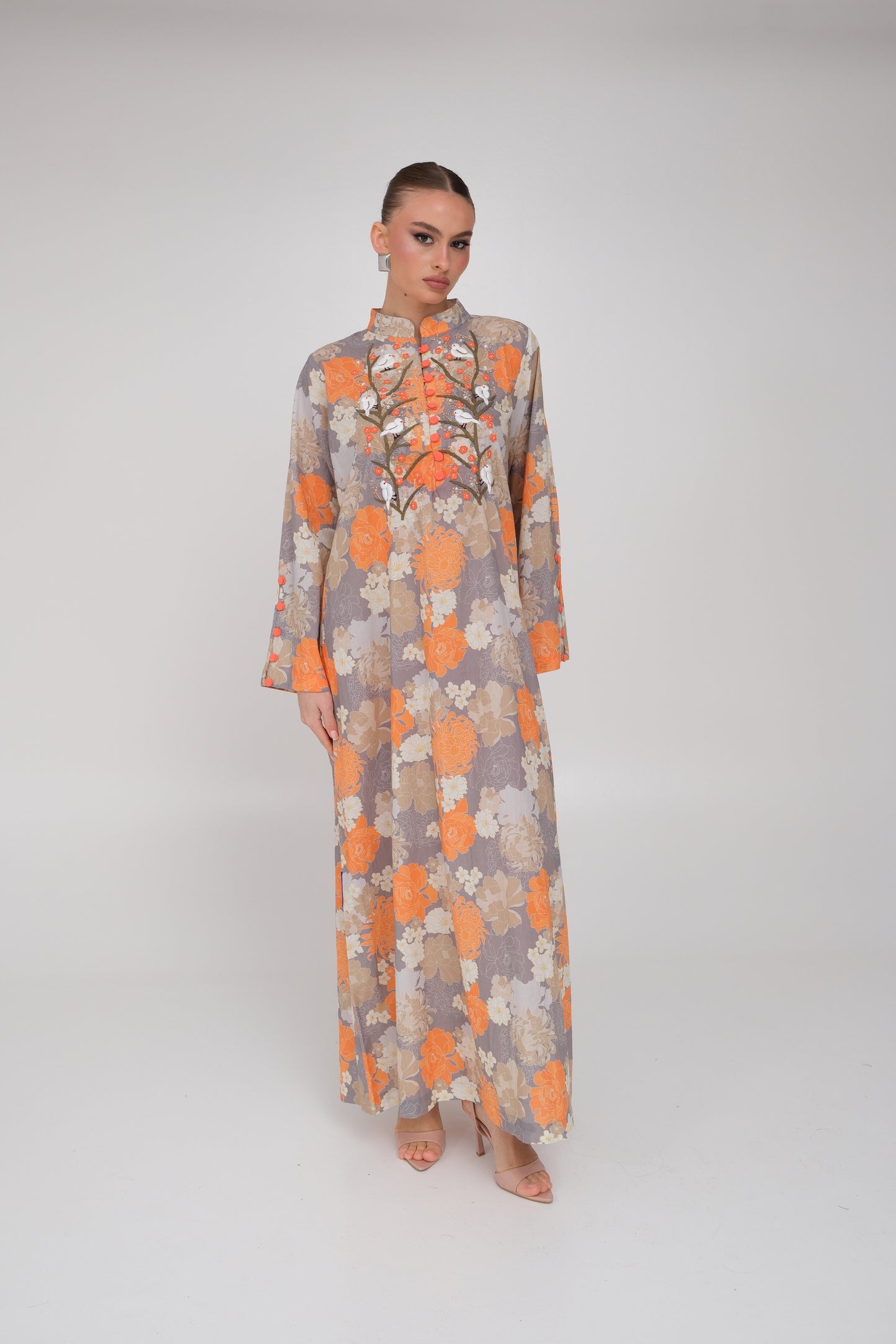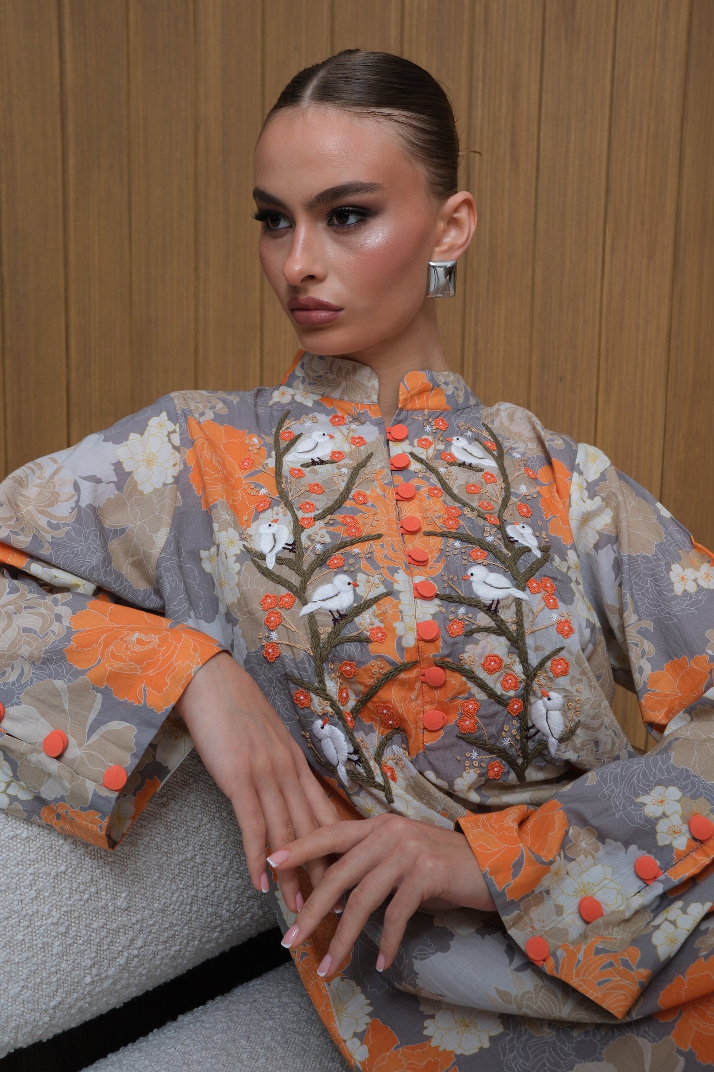 Crafted from soft, breathable cotton, this kaftan features birds and floral embroidery inspired by nature. Finished with fabric-covered buttons on the front and sleeves on the front and sleeves for a delicate handcrafted touch. Light and comfortable, perfect for everyday wear.