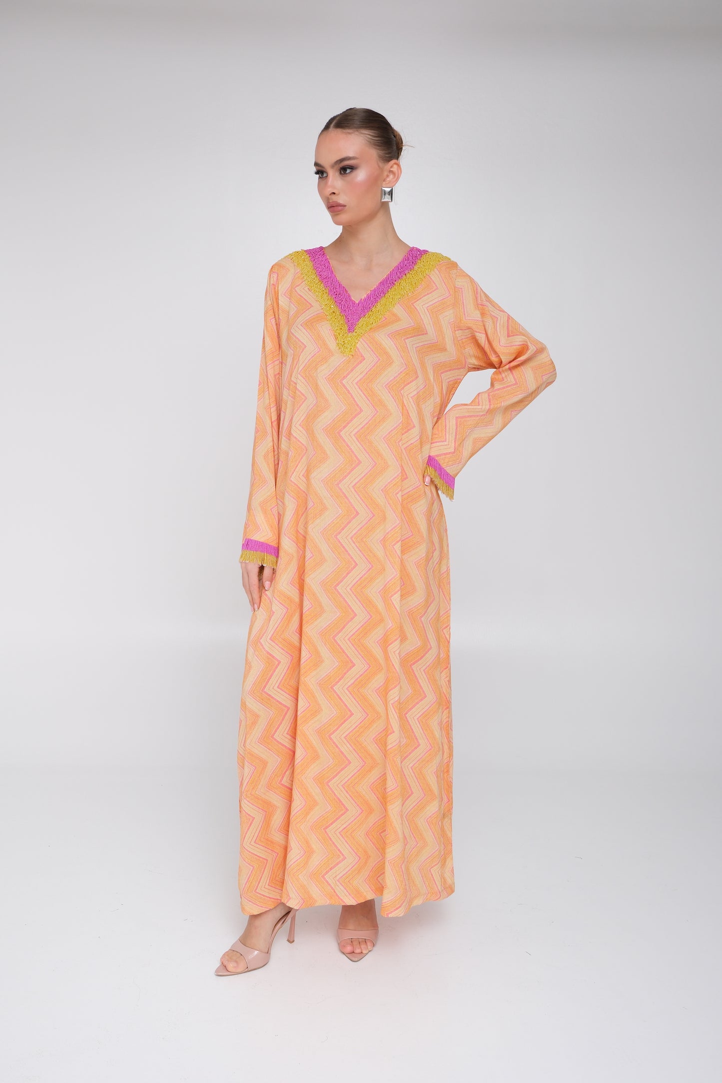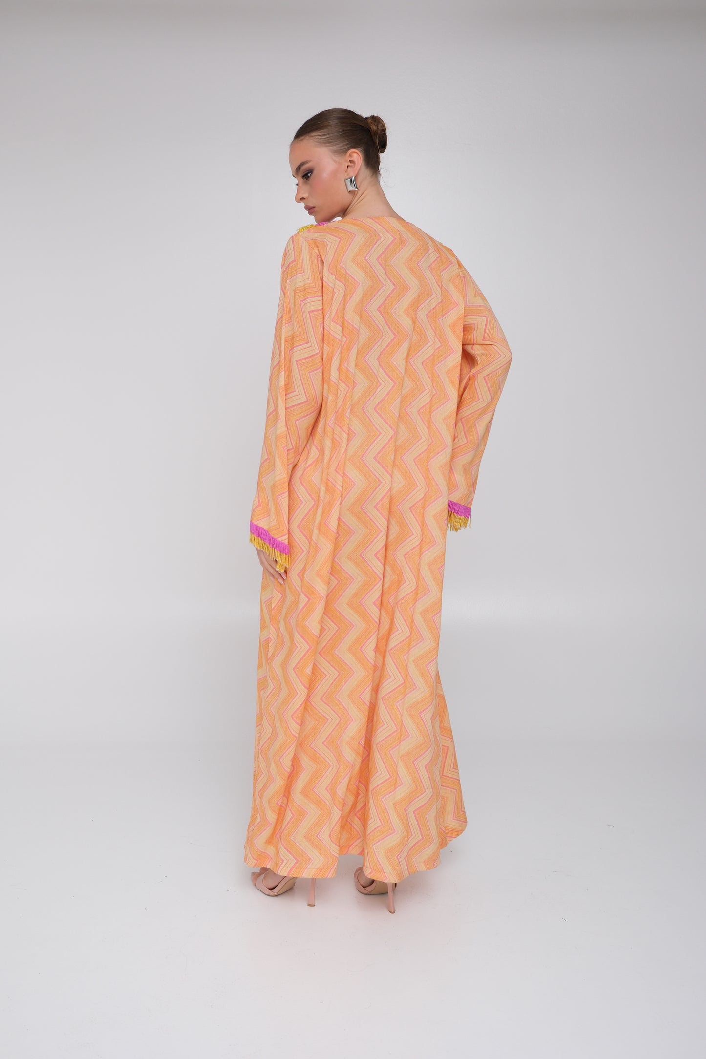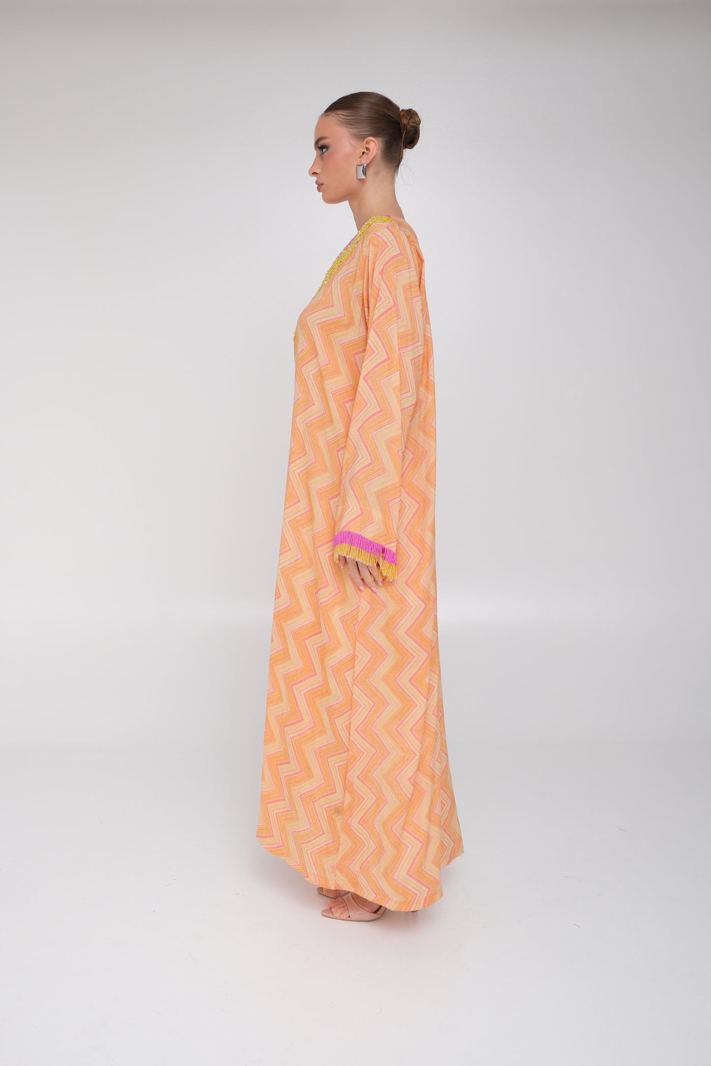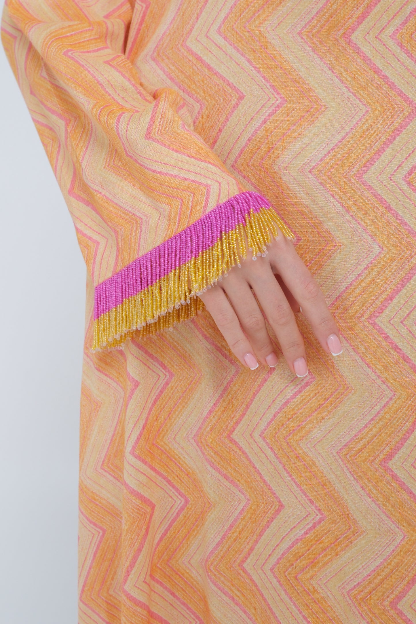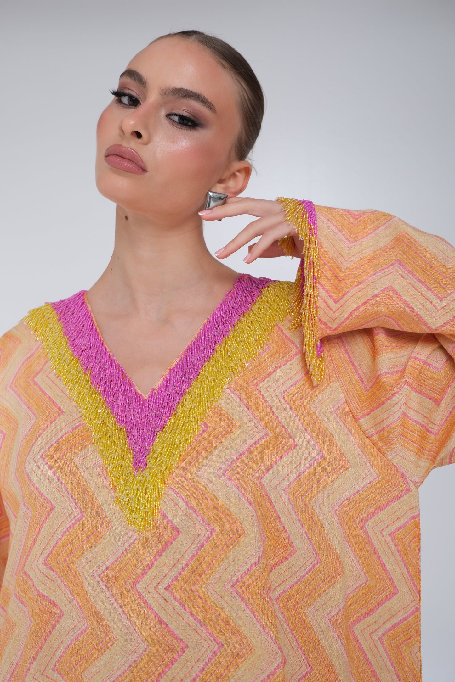 Featuring zigzag-printed cotton fabric, this piece is detailed with moving bright yellow and pink beads along the neckline, with matching moving bead detailing on the sleeves for a cohesive, playful finish.