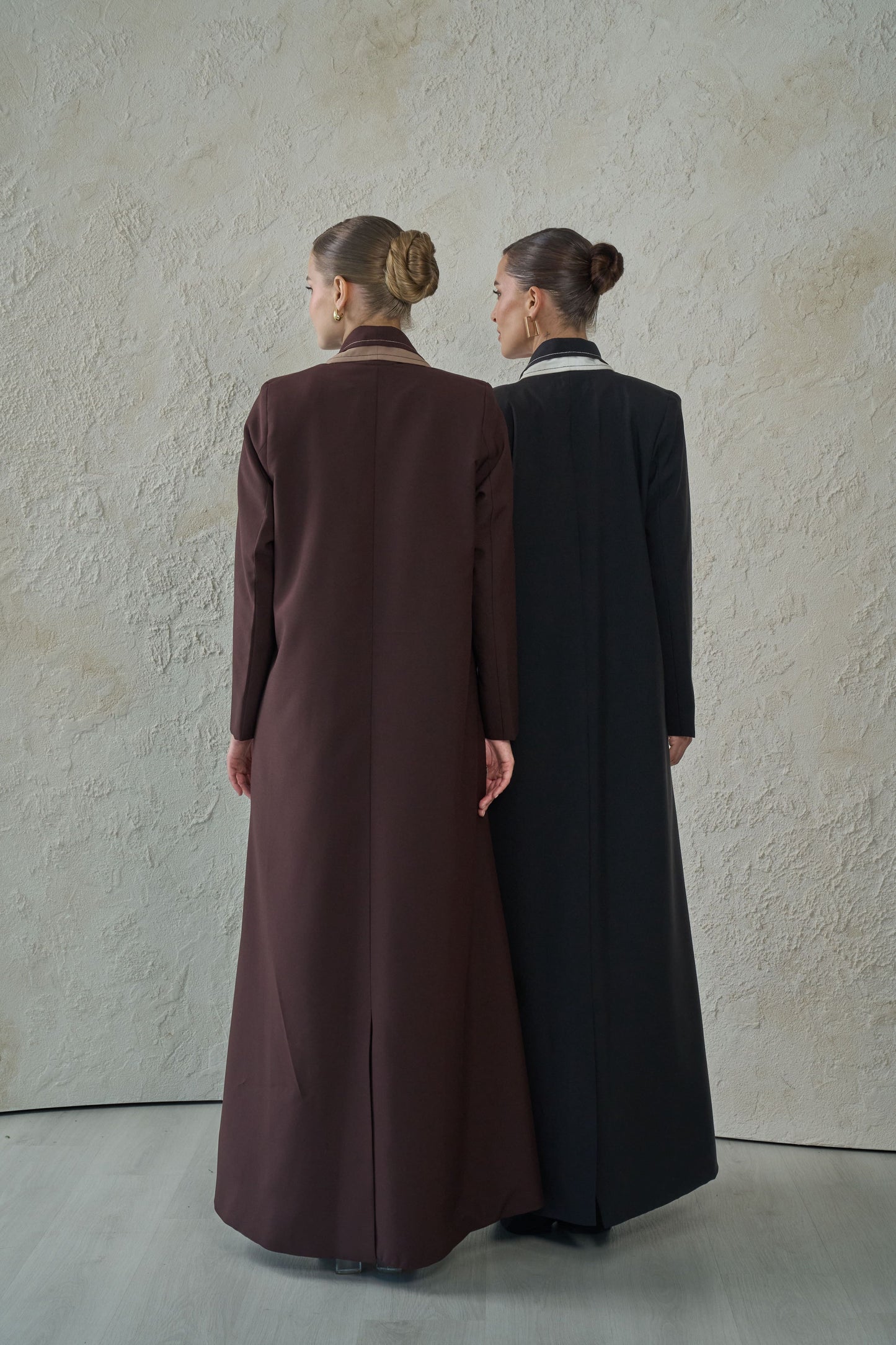 A sleek, suit-cut abaya detailed with a contrasting collar and structured shoulder pads for a sharp, elegant look. Available in rich brown and classic black color.