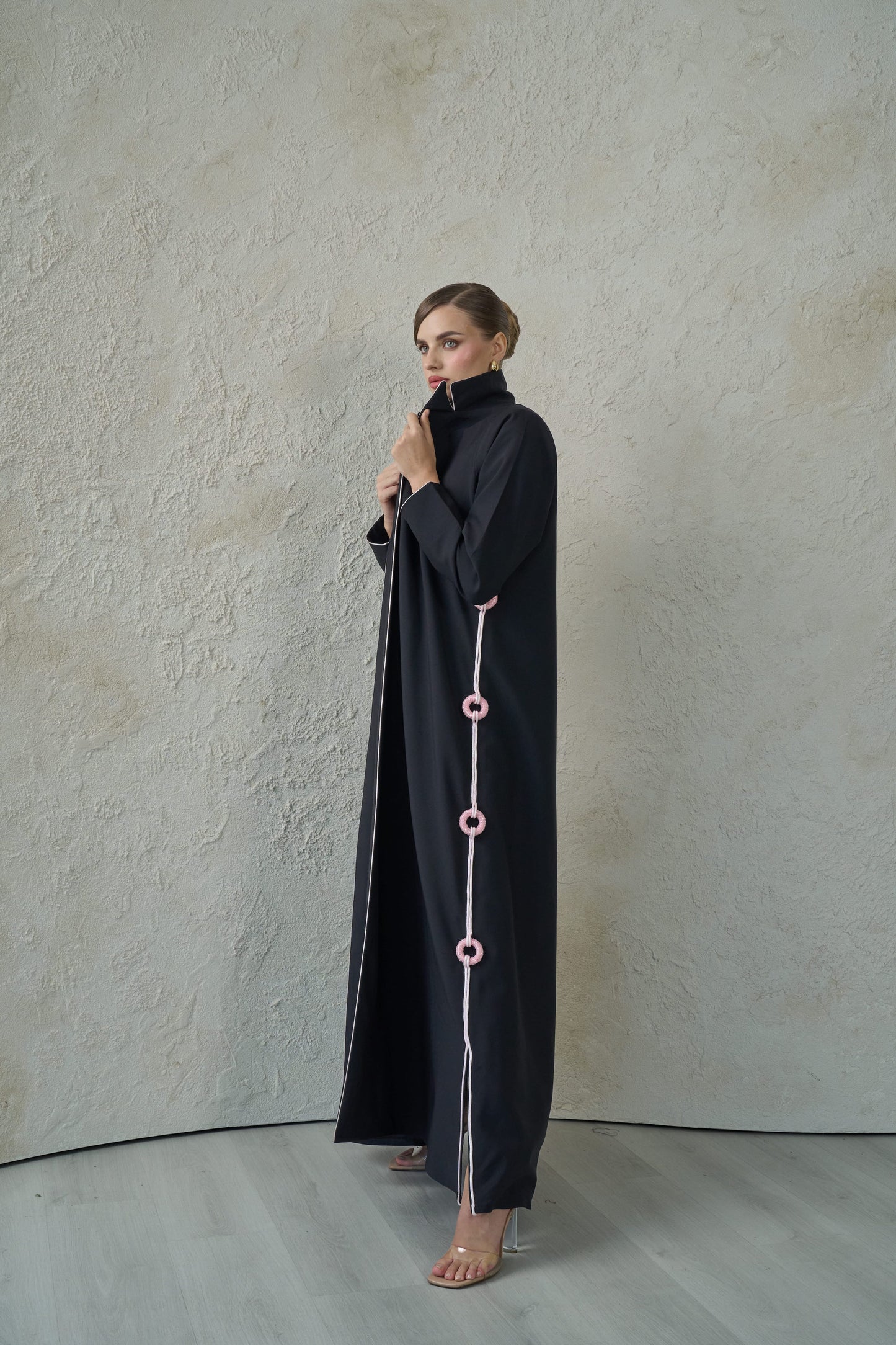 A sleek black abaya beautifully accented with striking pink circle beads and shimmering threads down the sides. Finished with structured shoulder pads, this graceful design brings a unique, feminine twist to a timeless silhouette.