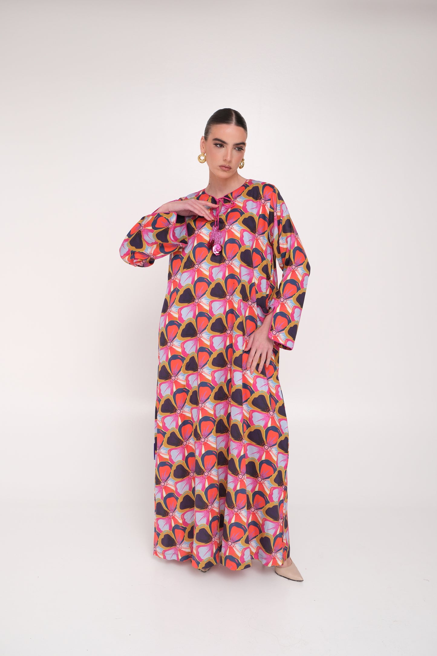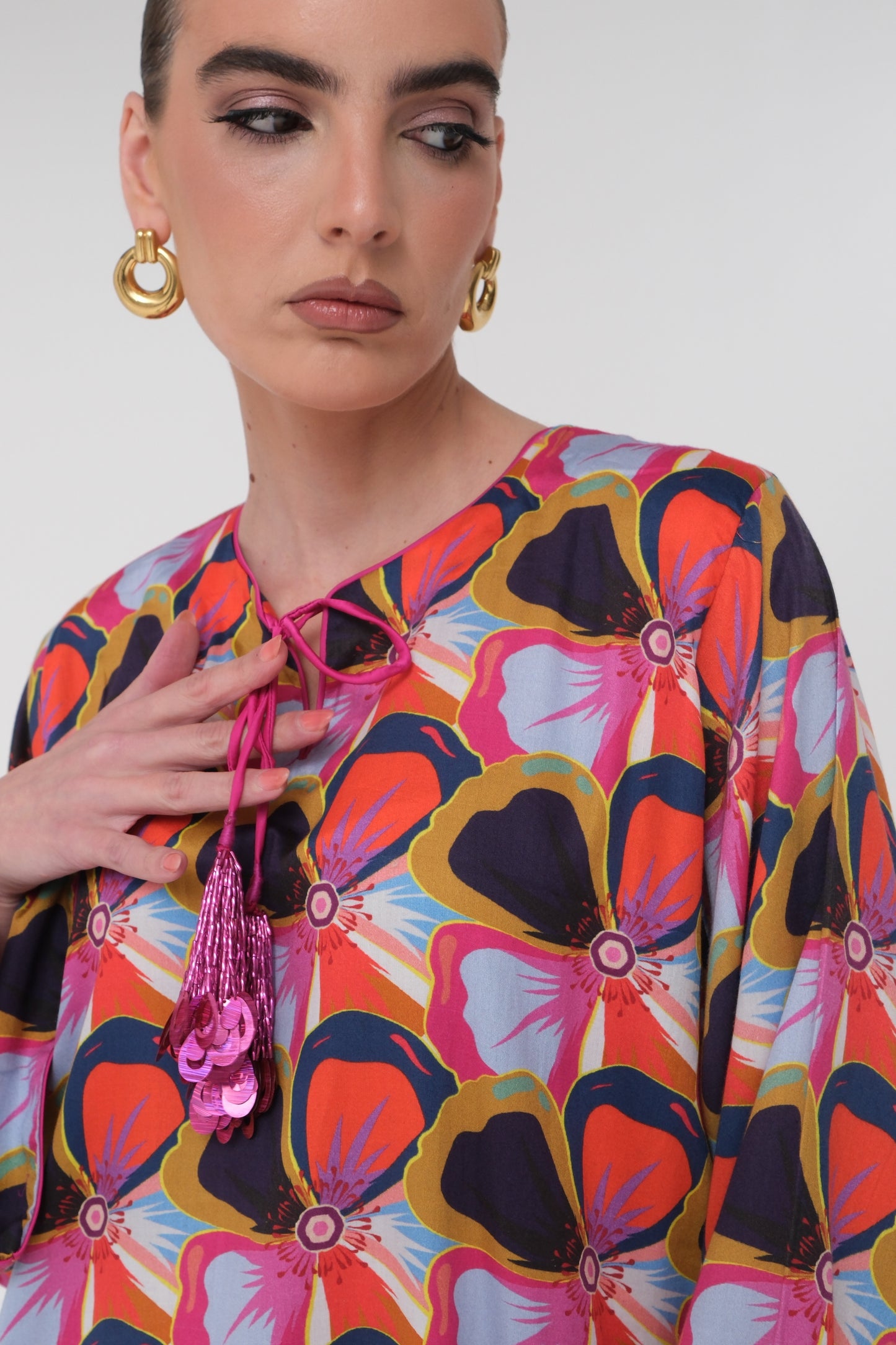 Made from soft cotton featuring a bold floral print, this kaftan is designed for effortless daily wear. It is finished with Ellezee's signature tie-knot detail and matching beaded tassels for a refined finish.