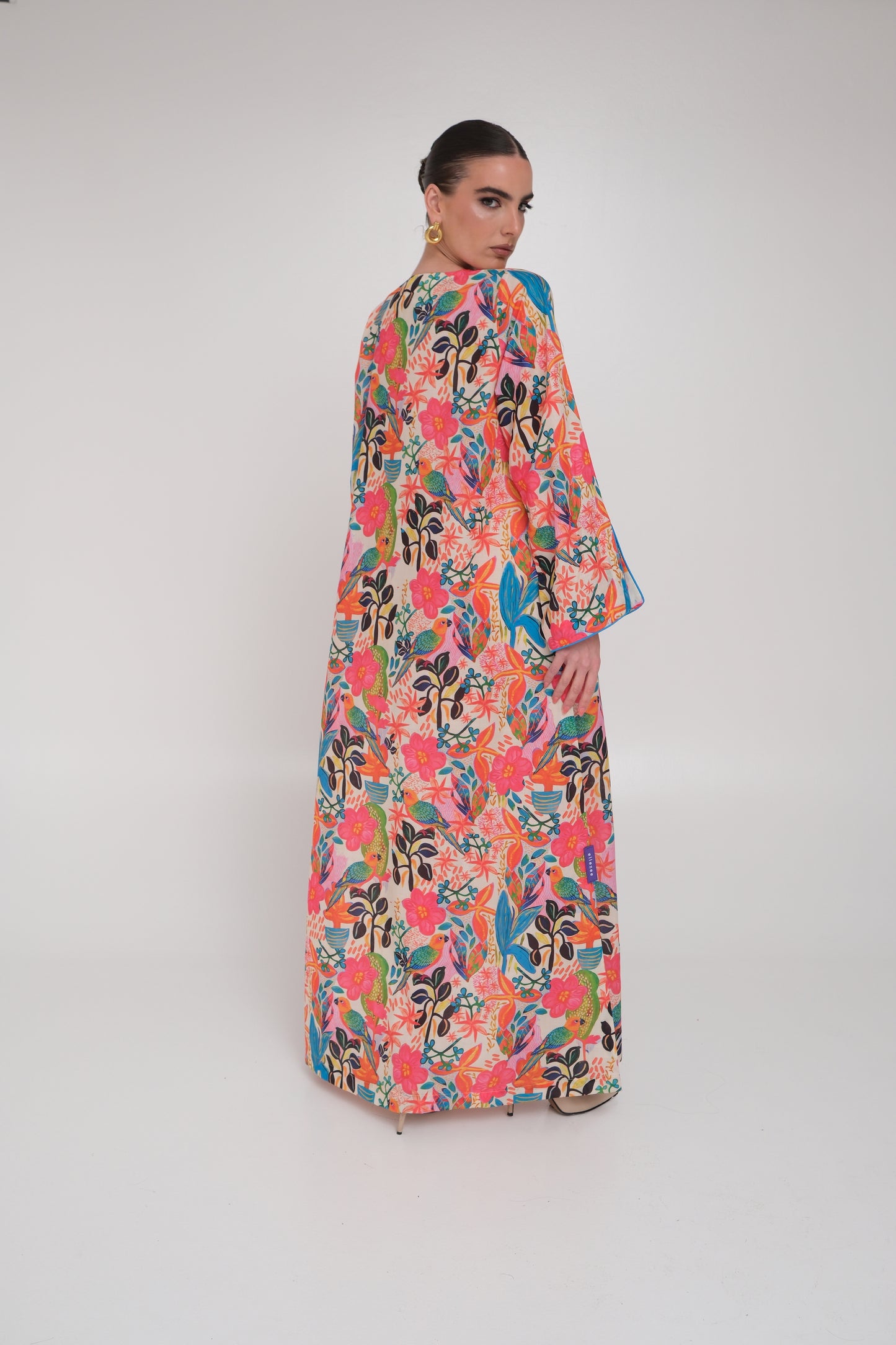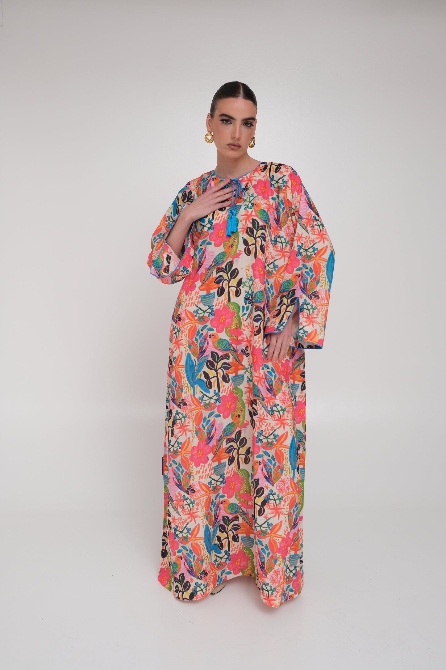 Crafted from soft, colorful cotton fabric with a floral and bird print, this kaftan is detailed with a signature tie-knot neckline and finished with blue tassels. Light and breathable, making it perfect for daily wear.