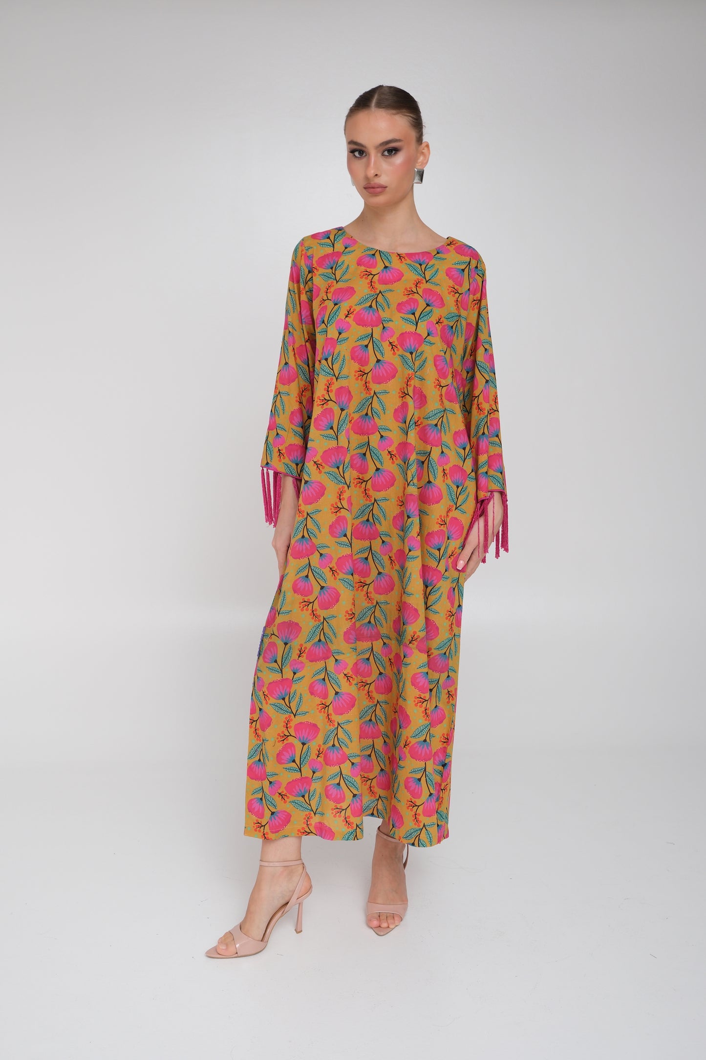 Made from soft cotton featuring a vibrant floral print, this kaftan is detailed with beaded fuchsia tassels on the sleeves that add graceful movement. Finished with an easy, flowing silhouette, making it suitable for all occasions.