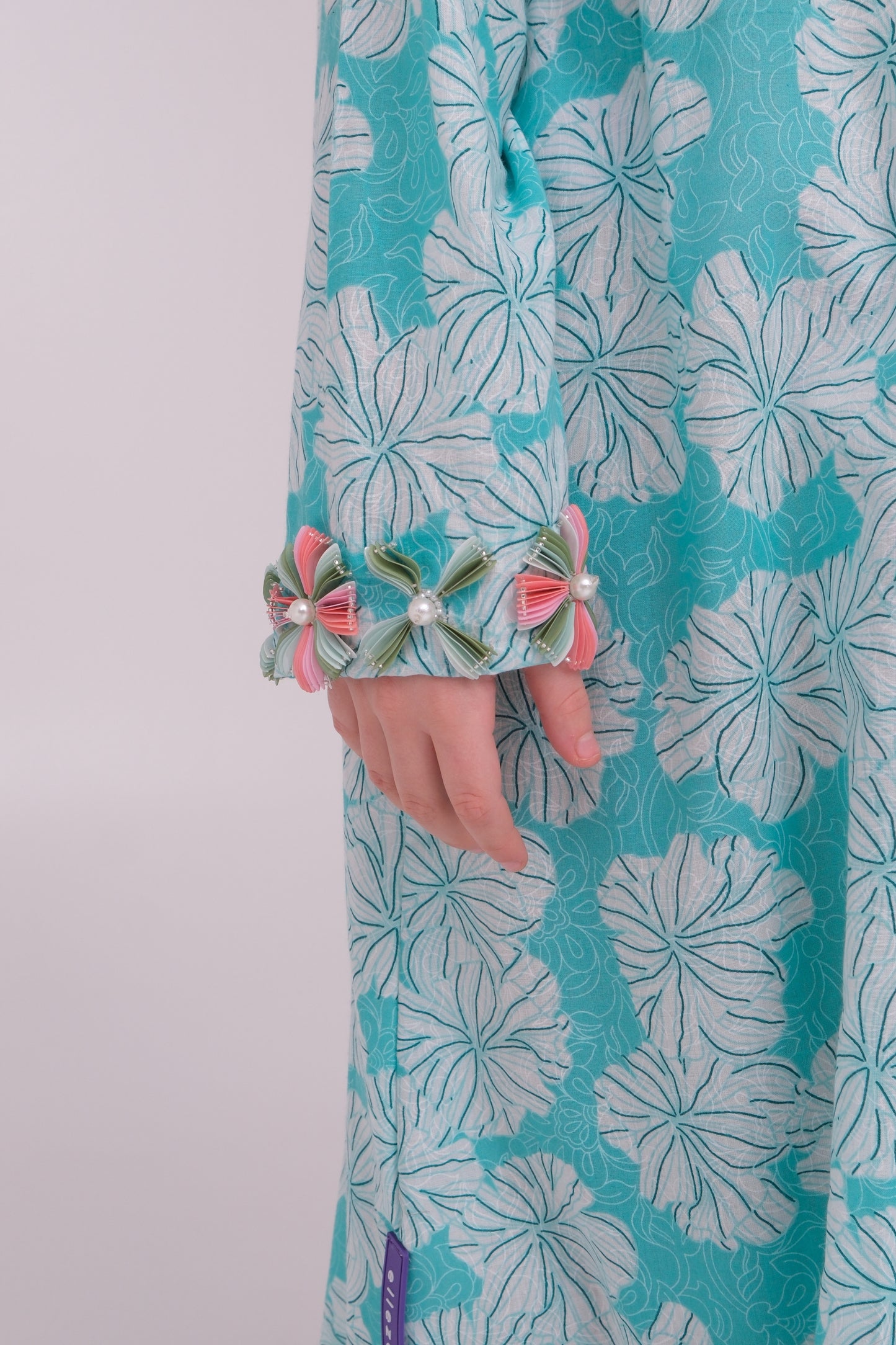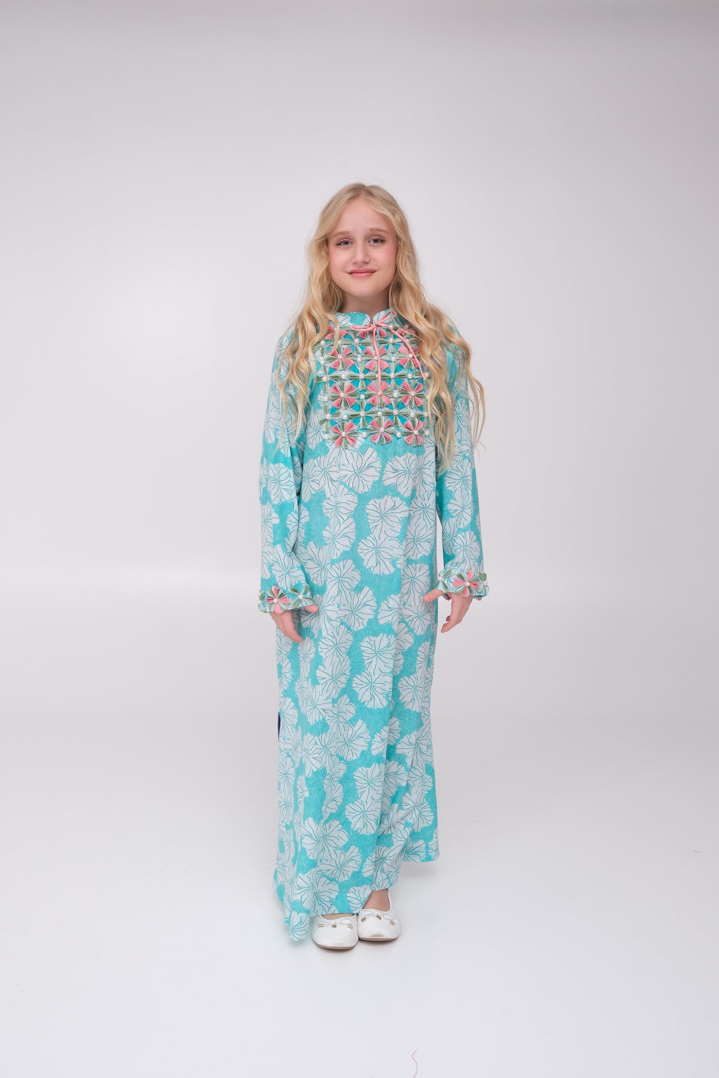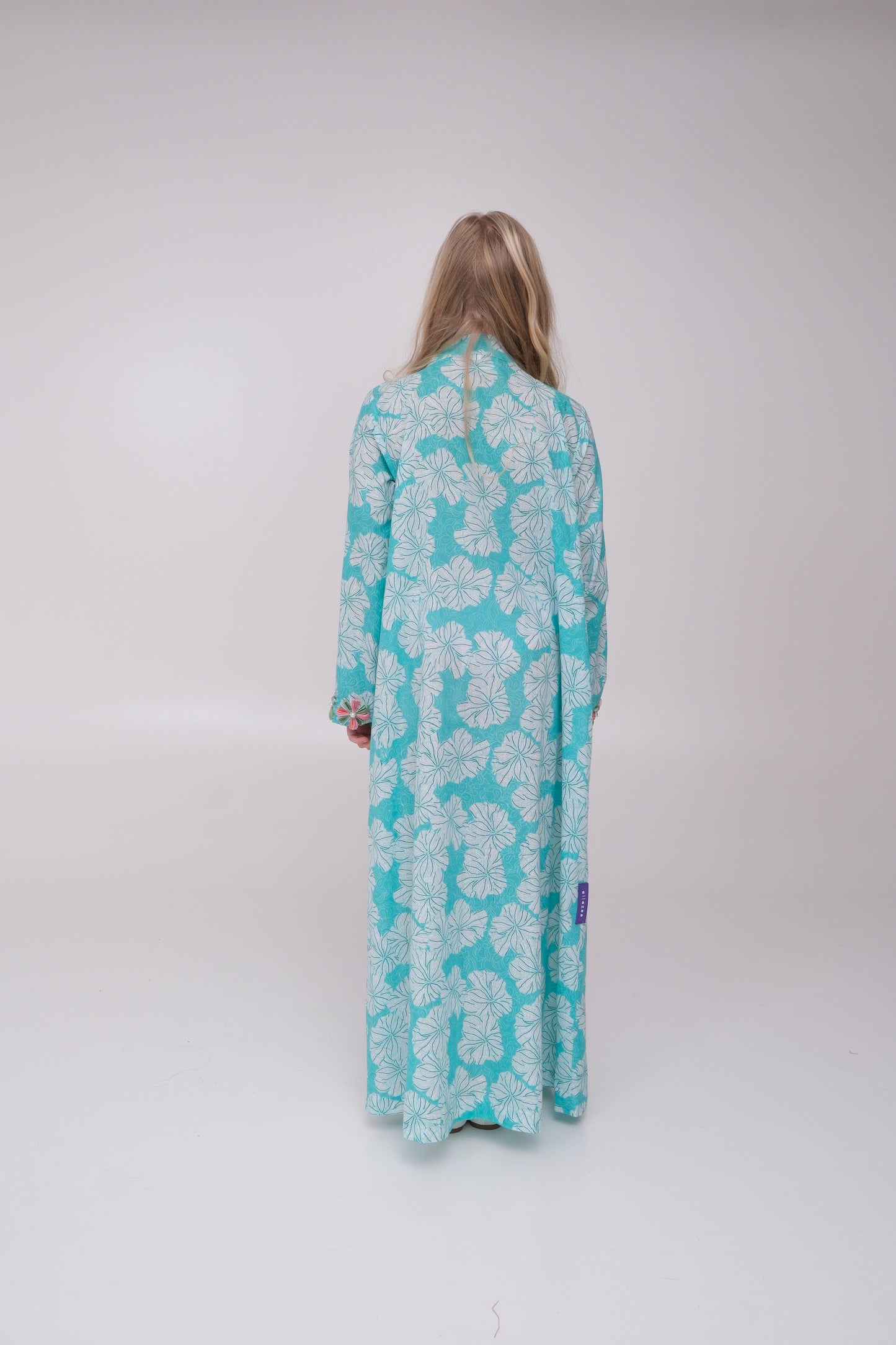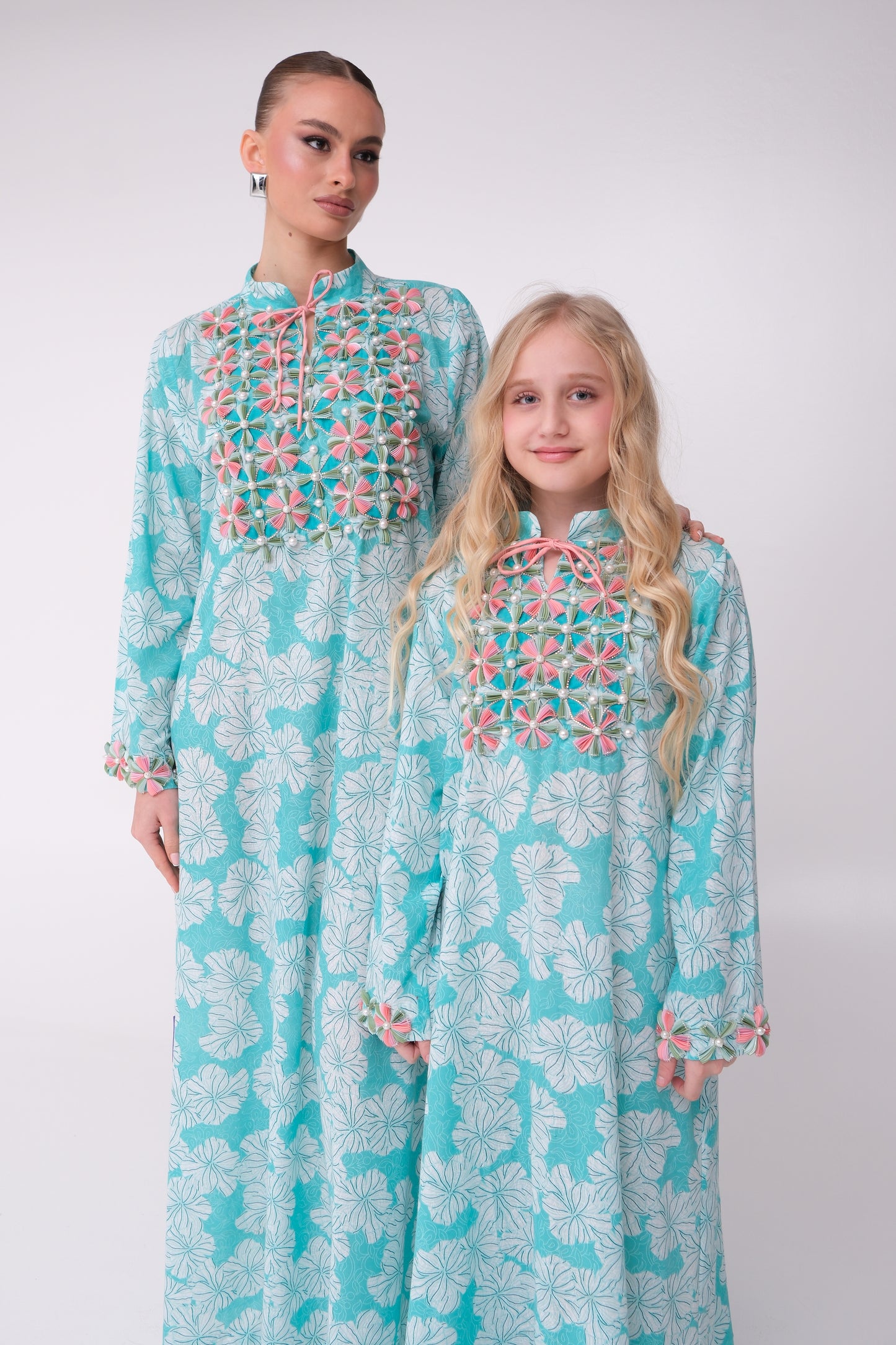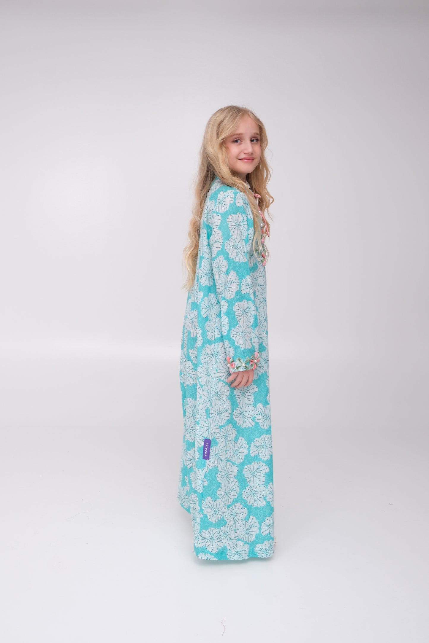 Made from cotton fabric, this kids kaftan features a delicate floral print with fine detailing on the neckline and sleeves. Finished with Ellezee's signature tie-knot detail for a refined touch, it is perfect for all occasions. A matching mother piece is available for a coordinated mother-daughter look.