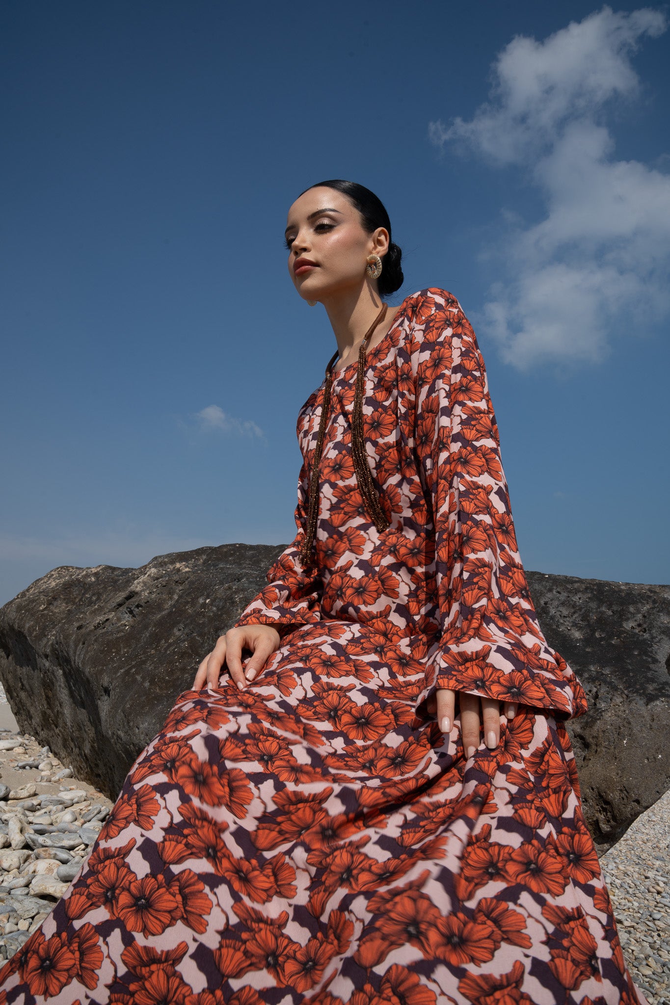 Regular price QAR 600,00Made from soft cotton fabric, this kaftan features a warm floral print in rich autumn tones. It comes paired with an exclusive brown beaded necklace, designed to elevate the look with effortless elegance.