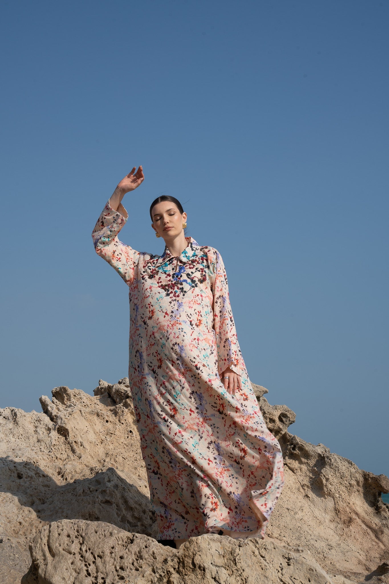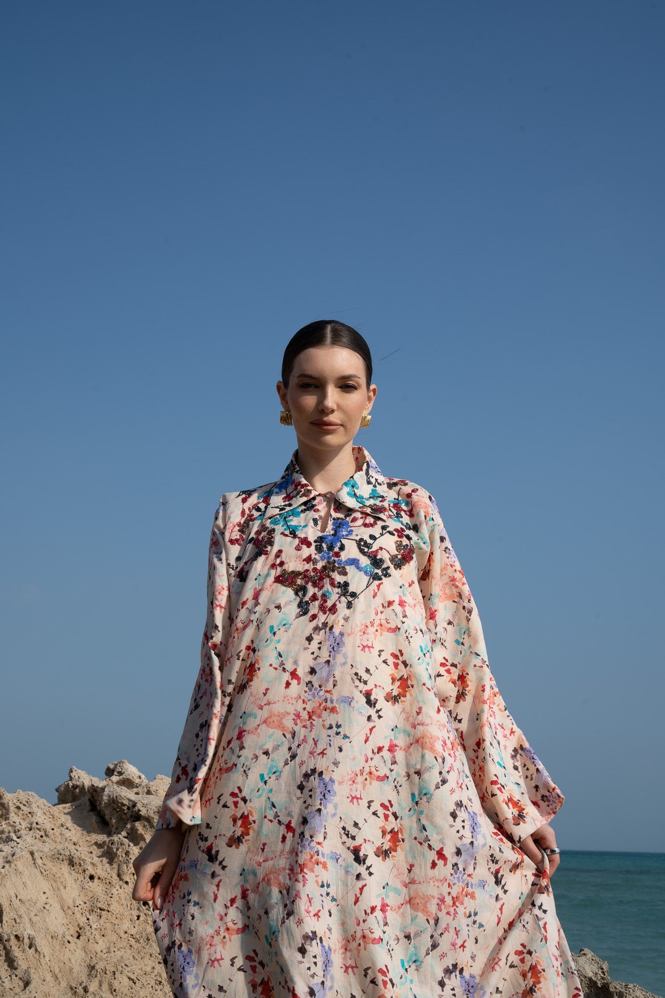 Regular price QAR 750,00Made from breathable cotton, this piece features a soft floral splash print that feels fresh and feminine. Designed with a classic collar, it blends comfort and charm in an effortlessly stylish look.