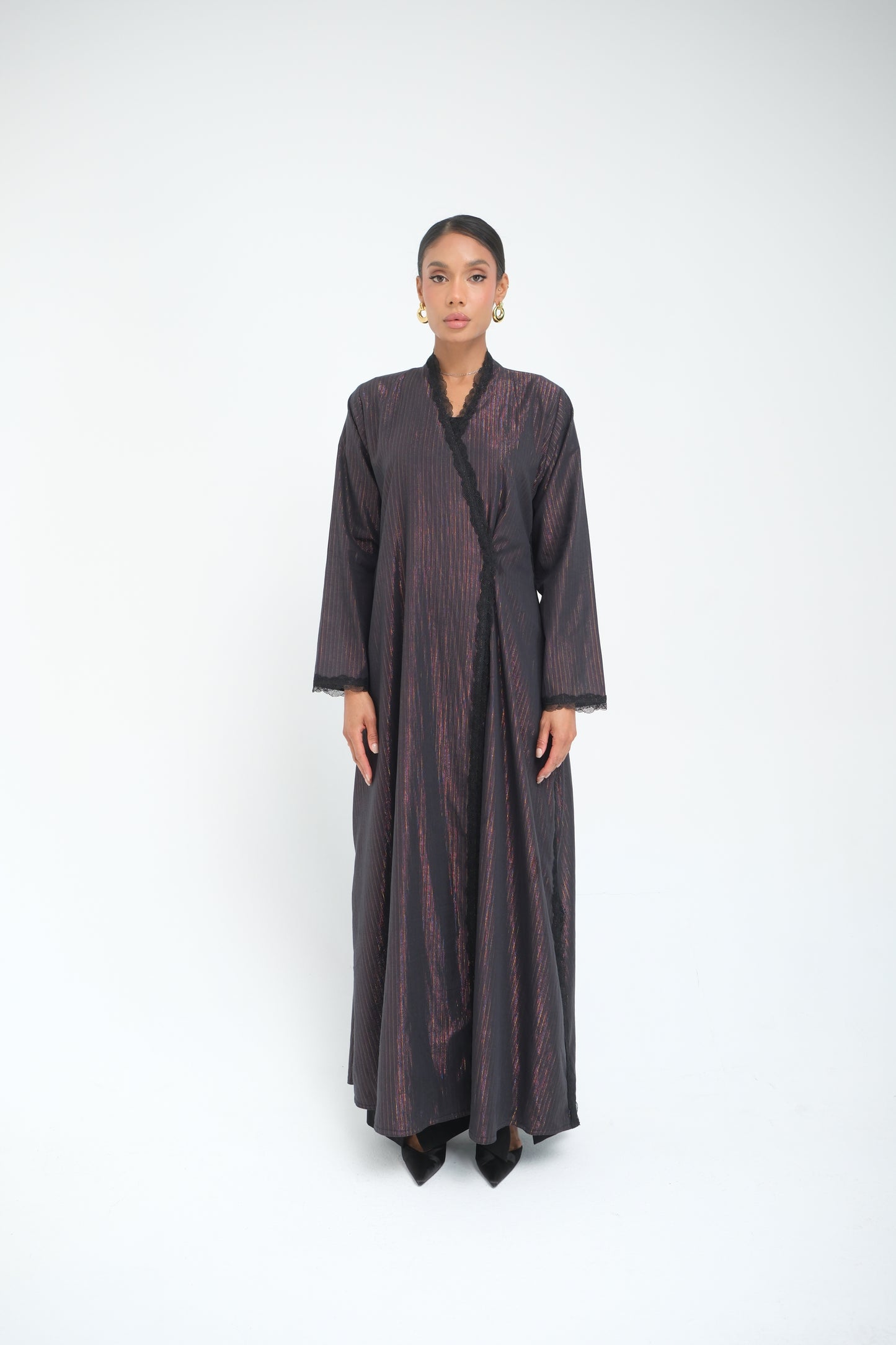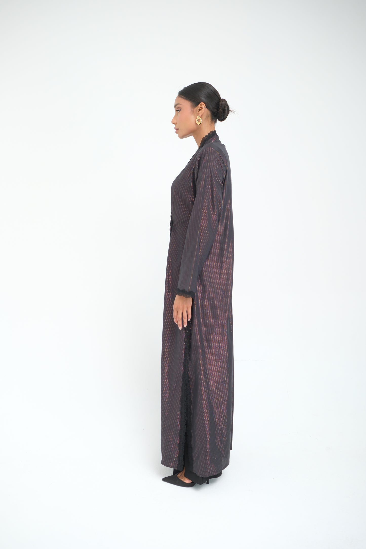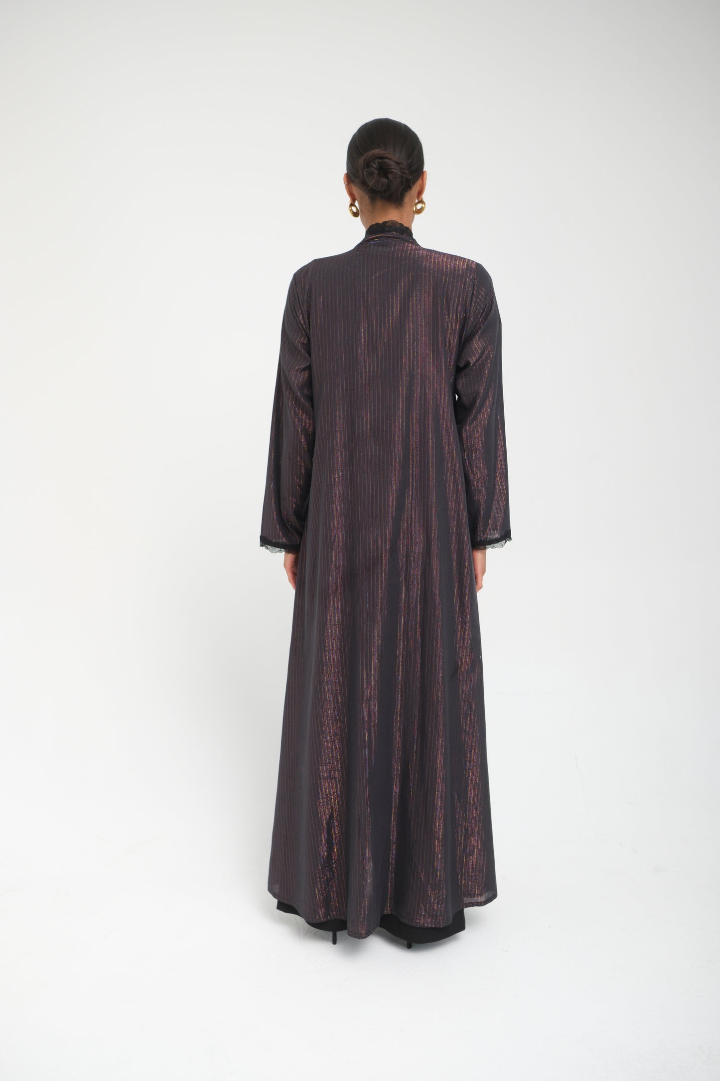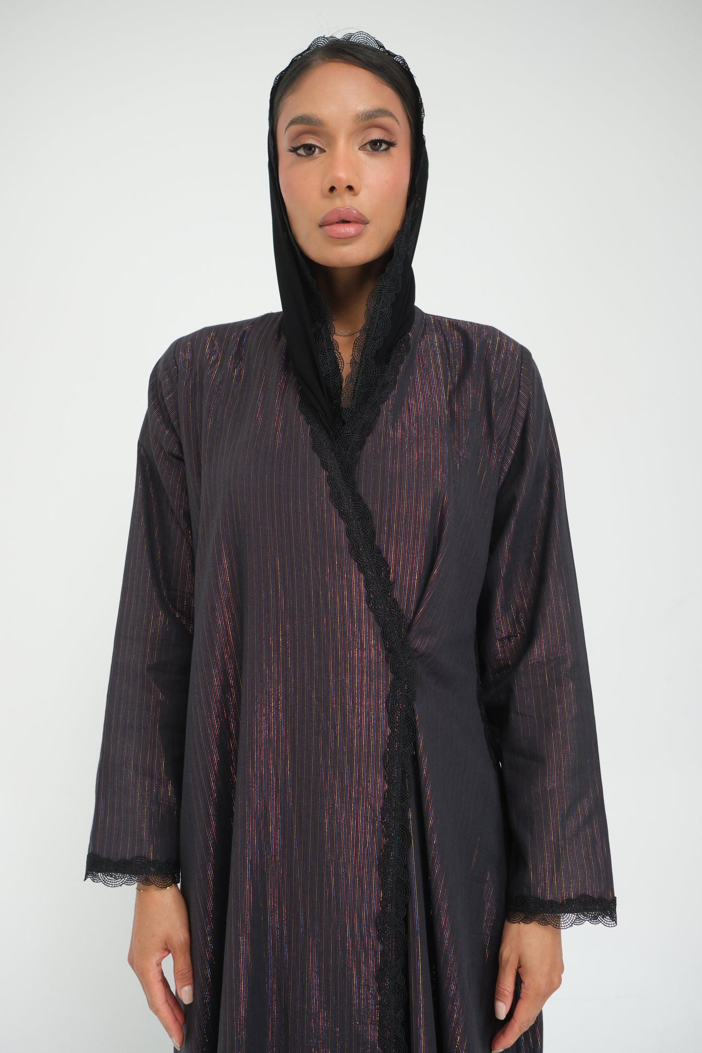 A graceful abaya crafted from striped shiny rainbow fabric that catches the light beautifully with every movement. Designed with delicate lace detailing along the edges and side slits for easy flow. This piece comes with a matching detailed lace headscarf for a complete and elegant look.
