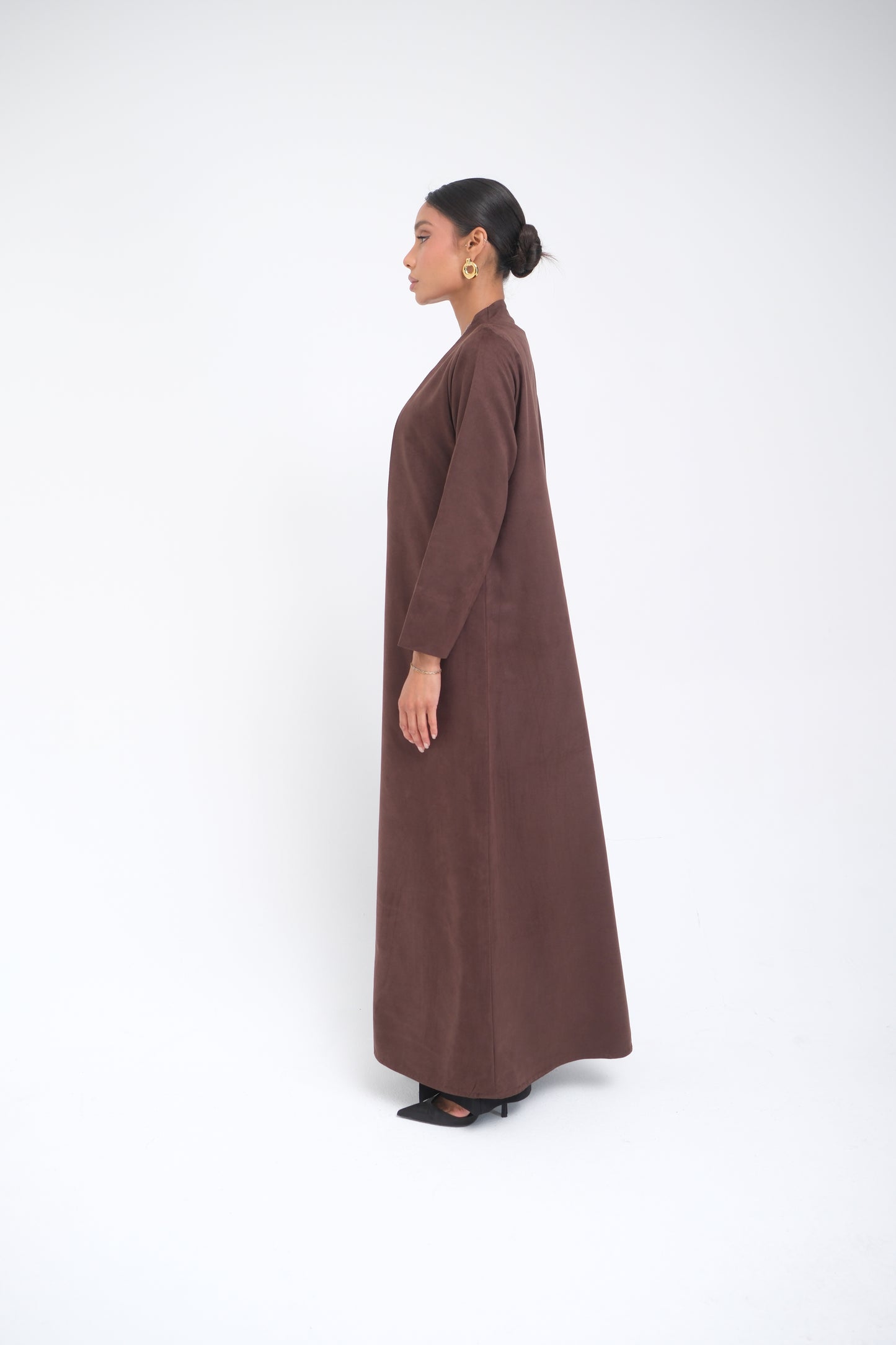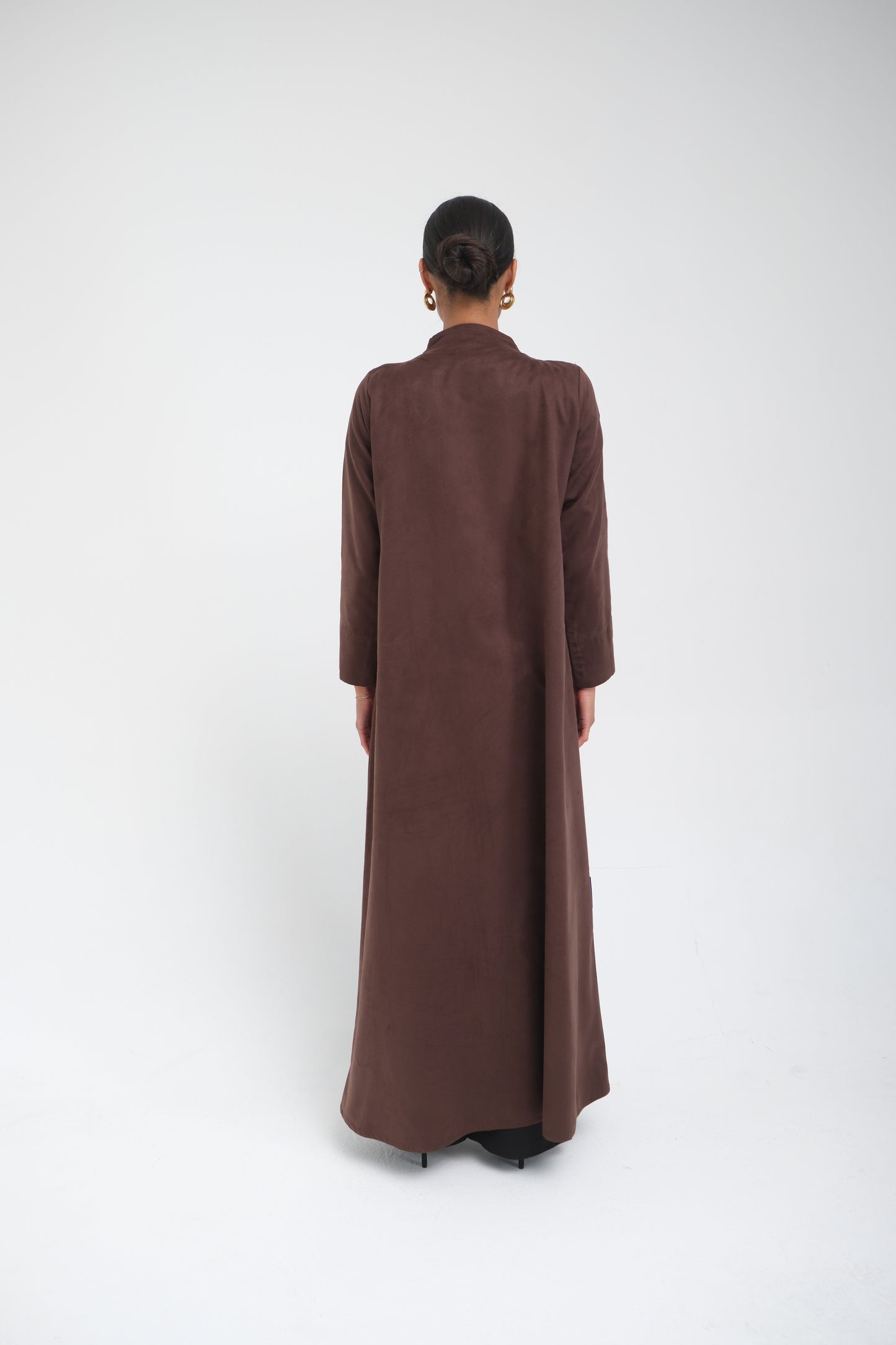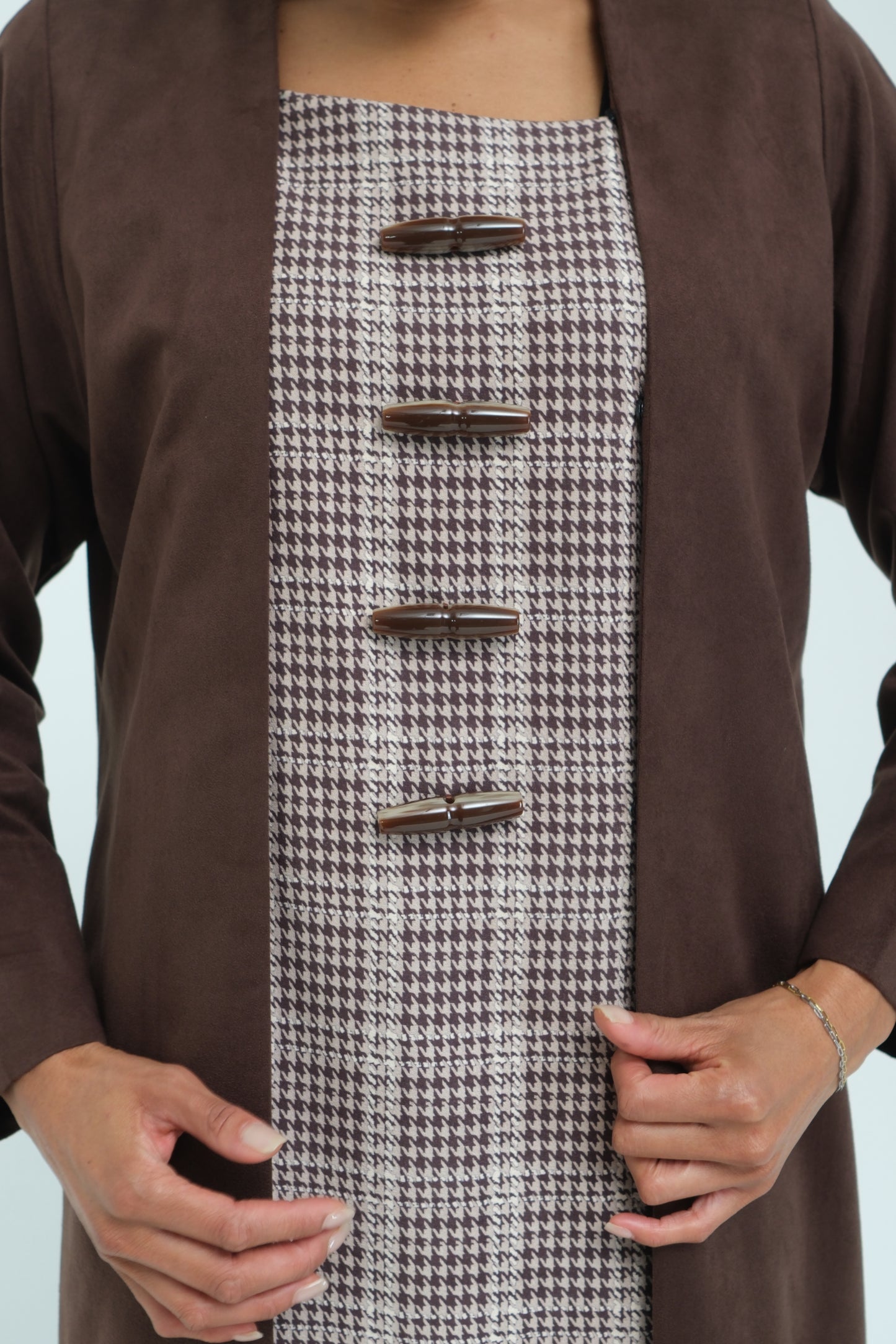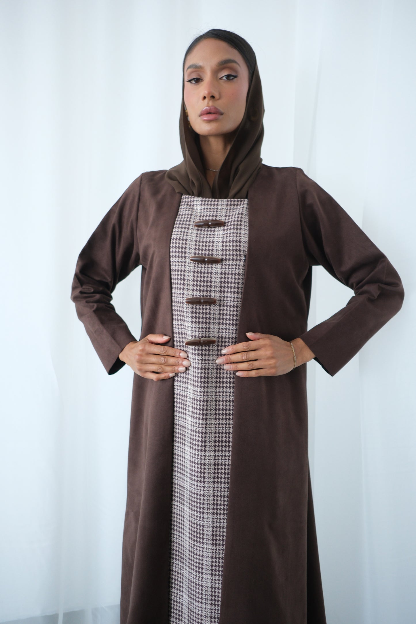 A sophisticated abaya crafted from lightweight brown suede fabric, paired with a houndstooth woven panel that adds structure and contrast. Finished with metal bar accents along the front for a modern, refined touch.