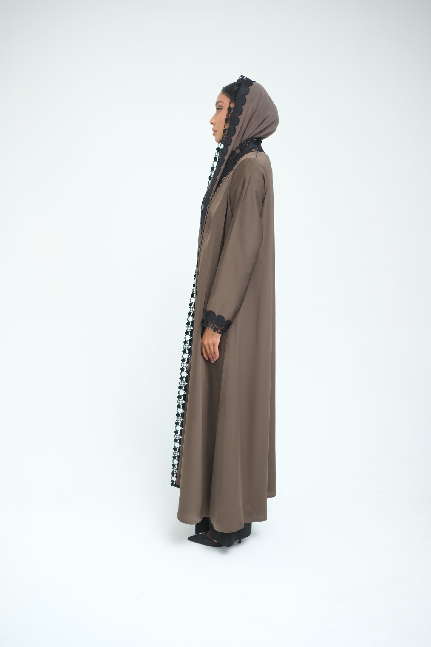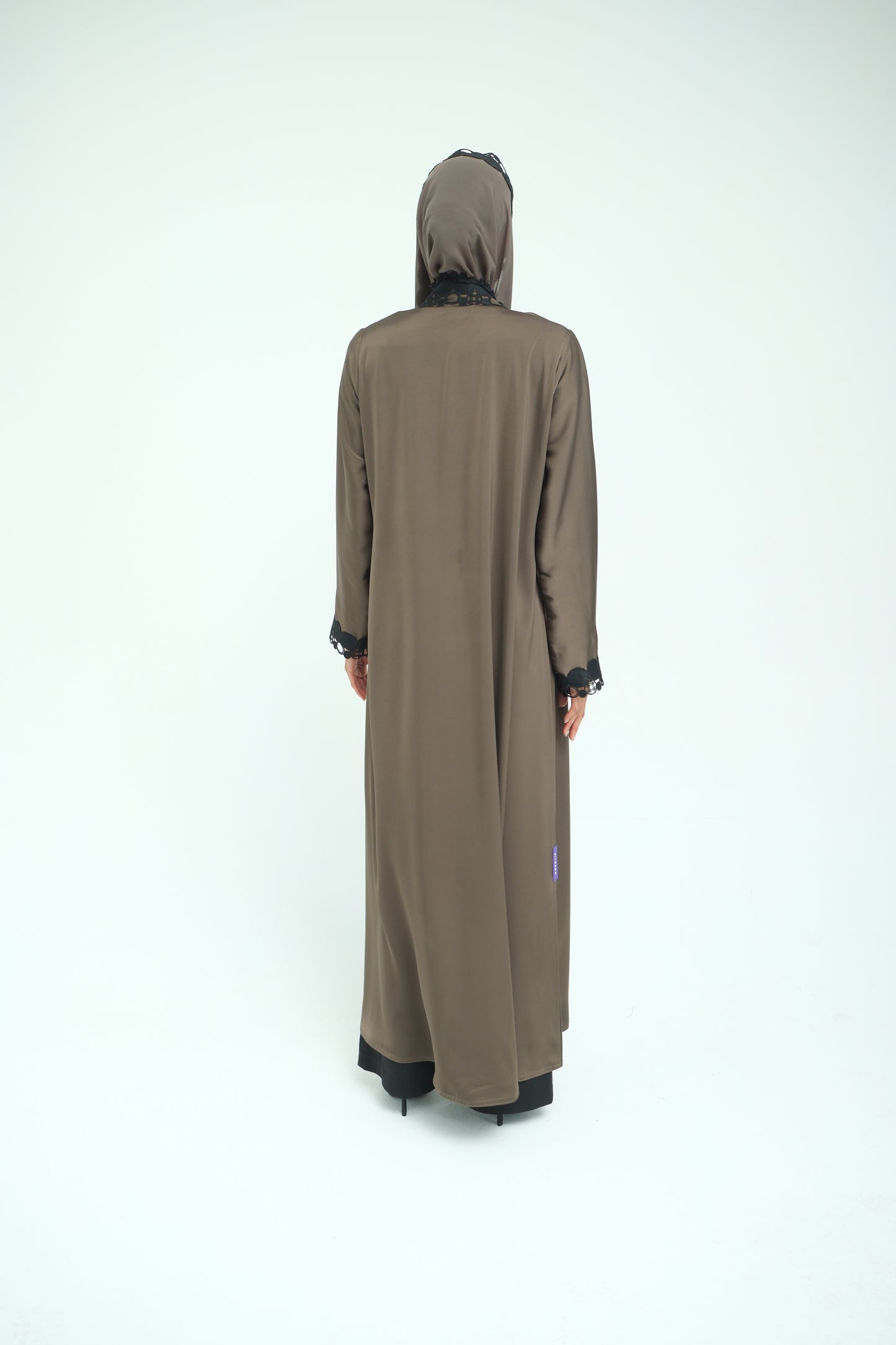 An elegant abaya crafted from olive-brown silk fabric, detailed with bold black circular lace along the front, sleeves, and headscarf. The soft silk drapes effortlessly, giving the piece a luxurious yet refined flow. A timeless design that blends earthy tones with delicate contrast — perfect for both day and evening wear.