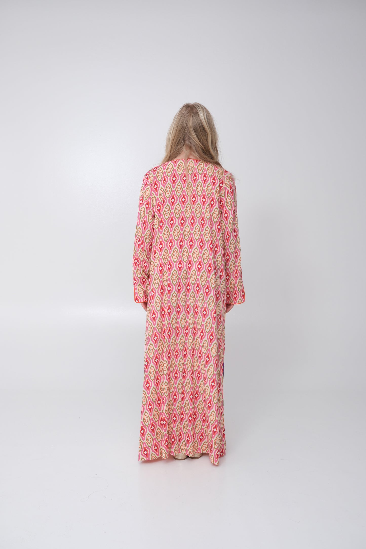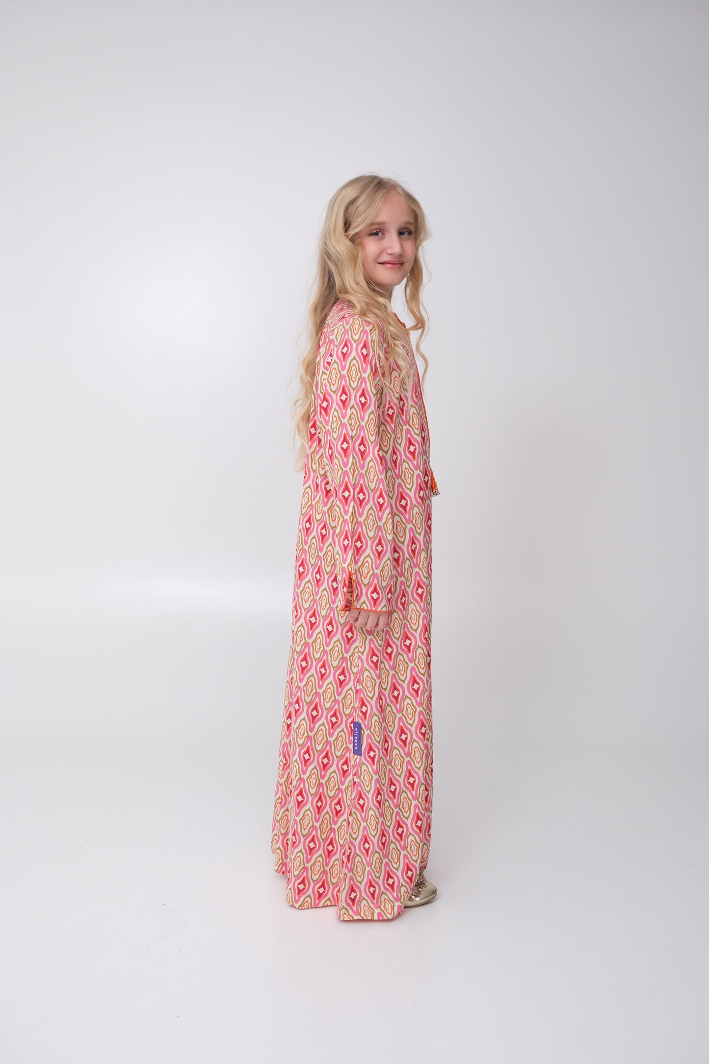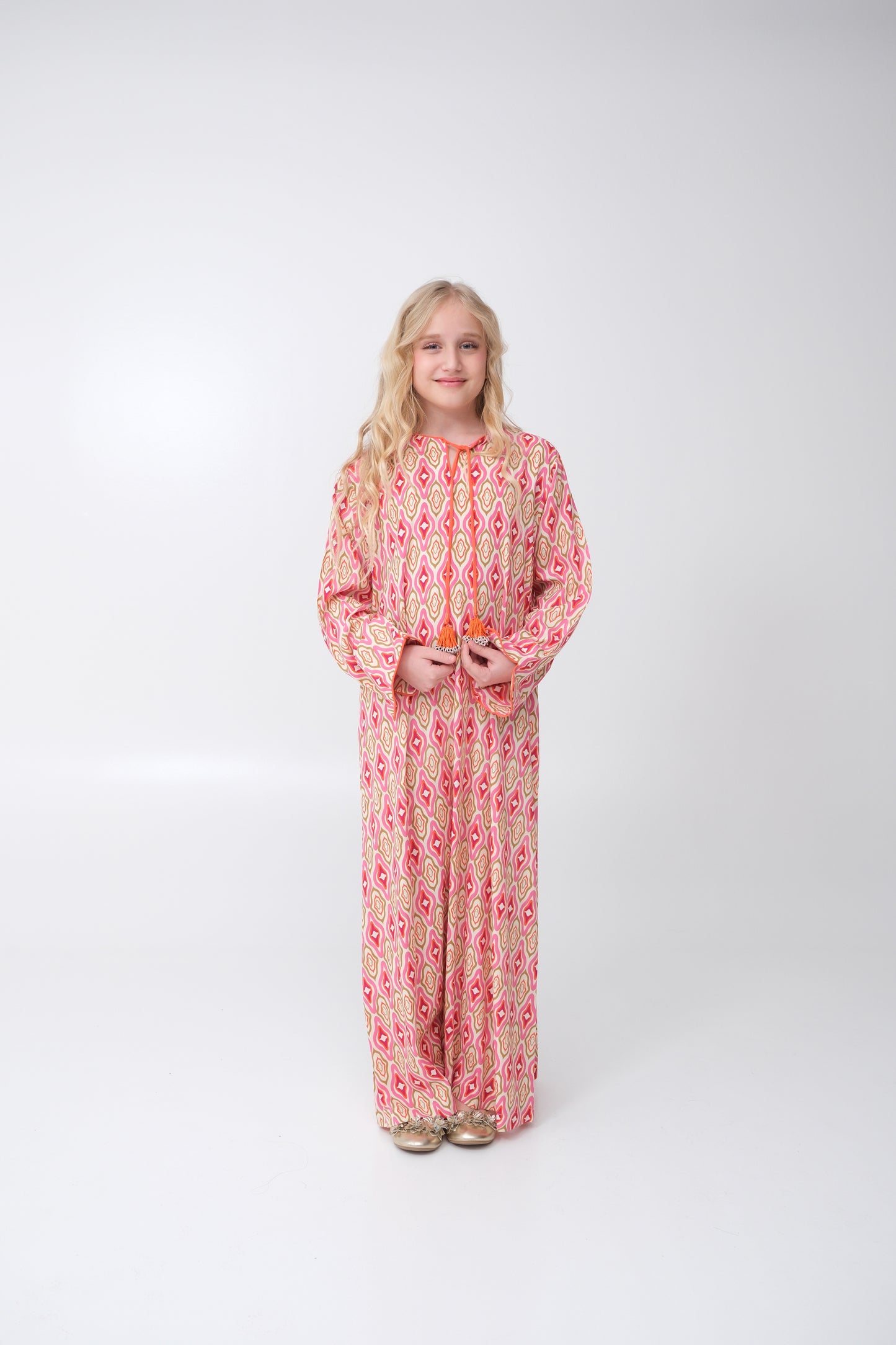 Made from comfortable cotton featuring a geometric print in warm pink tones, this kids kaftan is perfect for daily wear. It is finished with a tie-knot detail and matching beaded floral tassels for a cheerful touch.