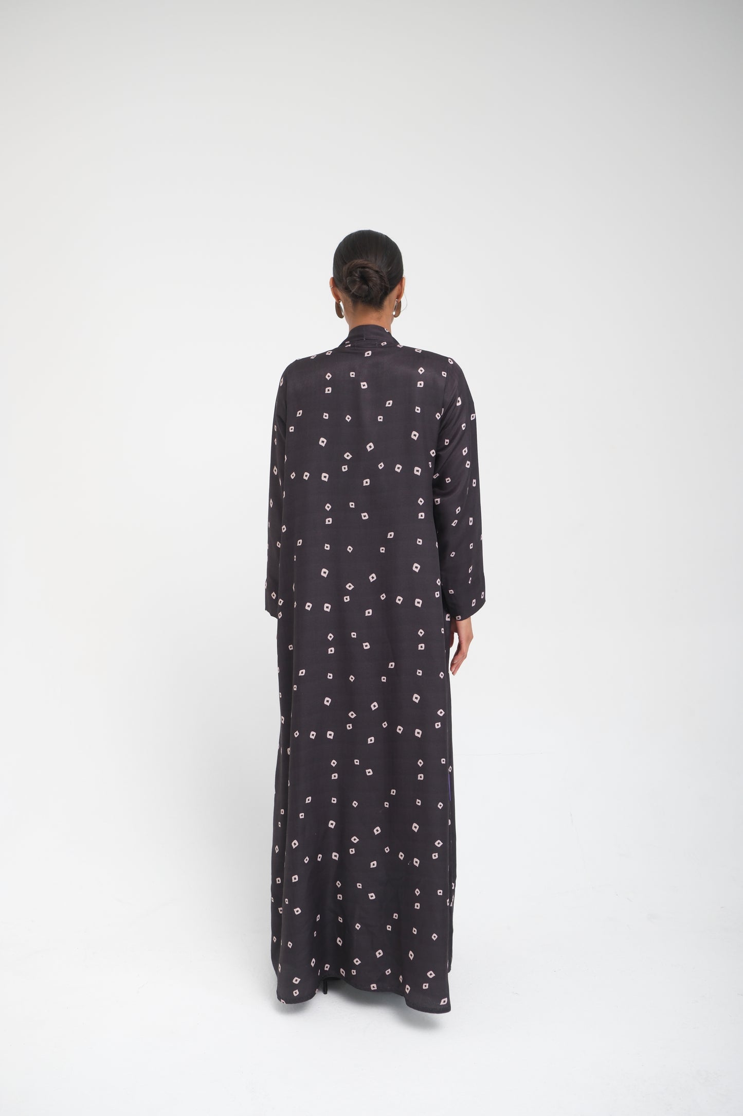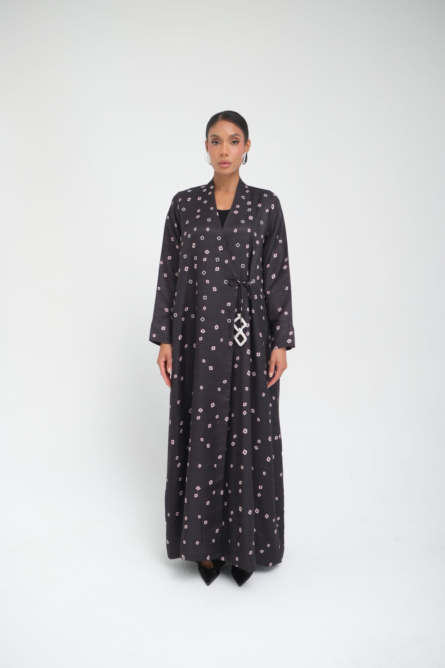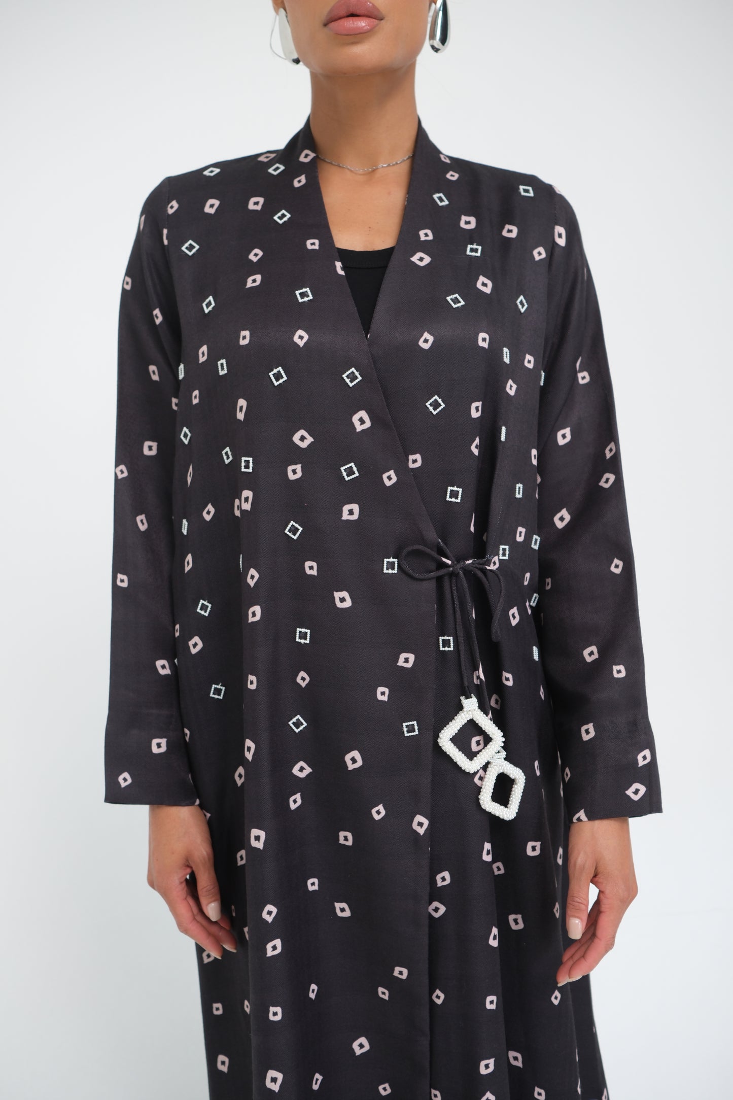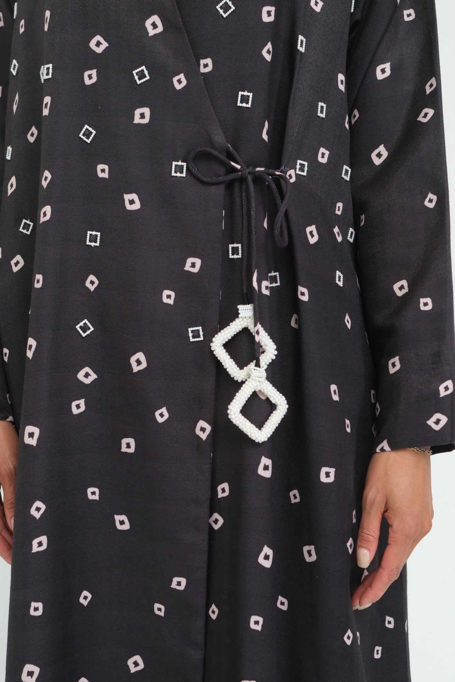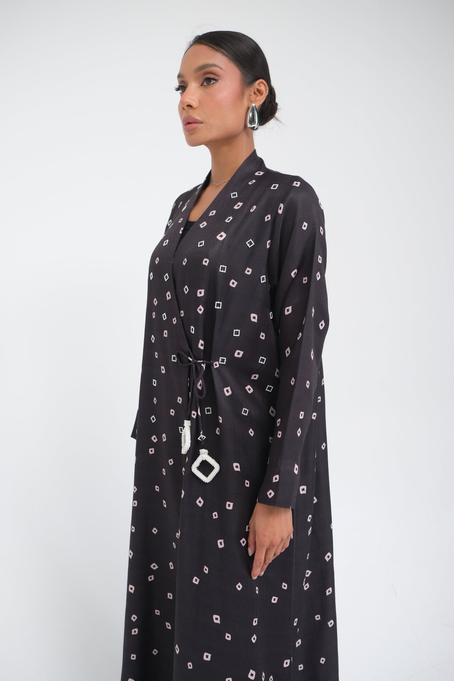 A stylish abaya made from soft crepe fabric printed with a square pattern. It's designed with pearl-beaded squares and tied at the waist with a tie-knot featuring large pearl square details.