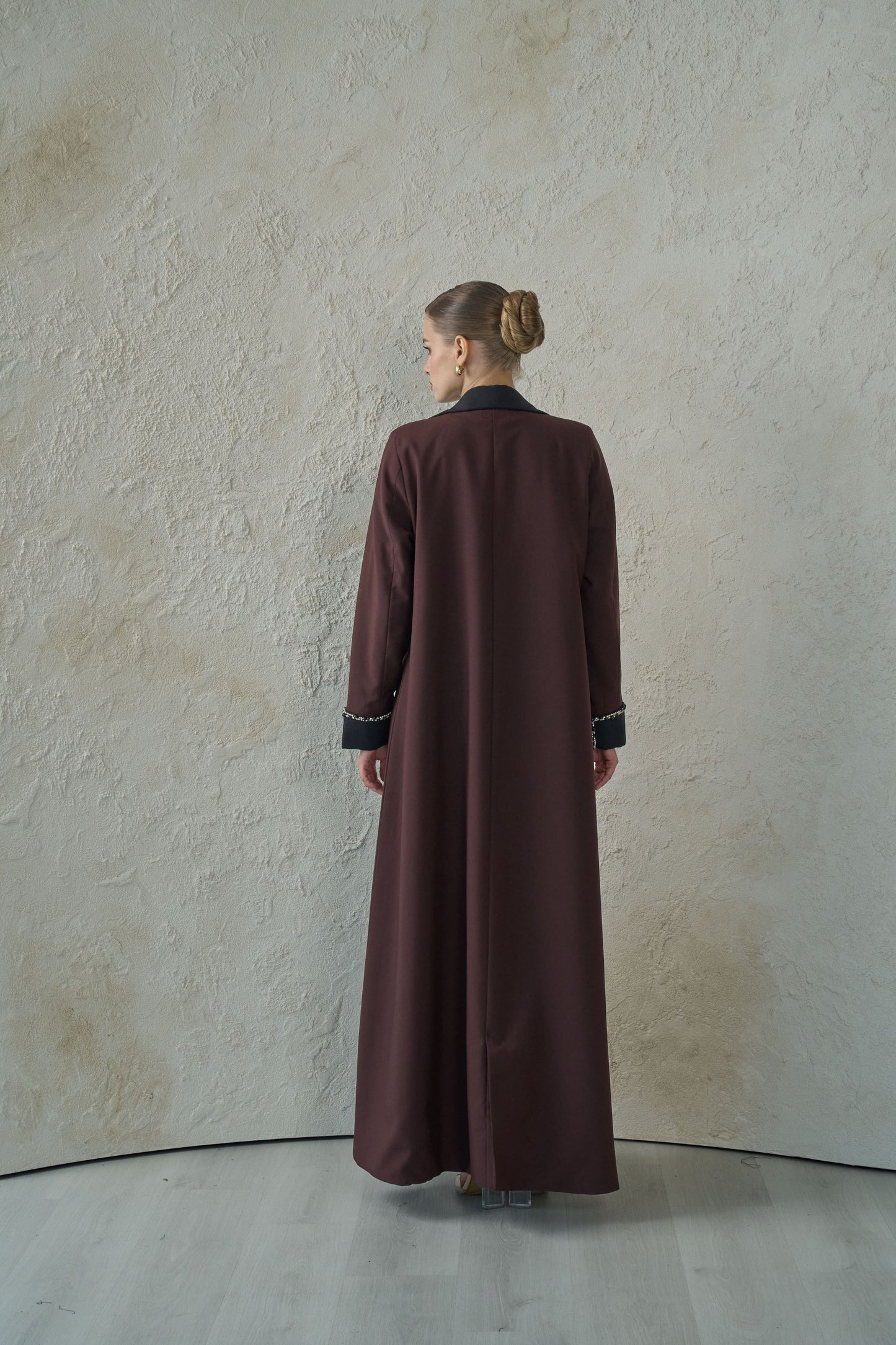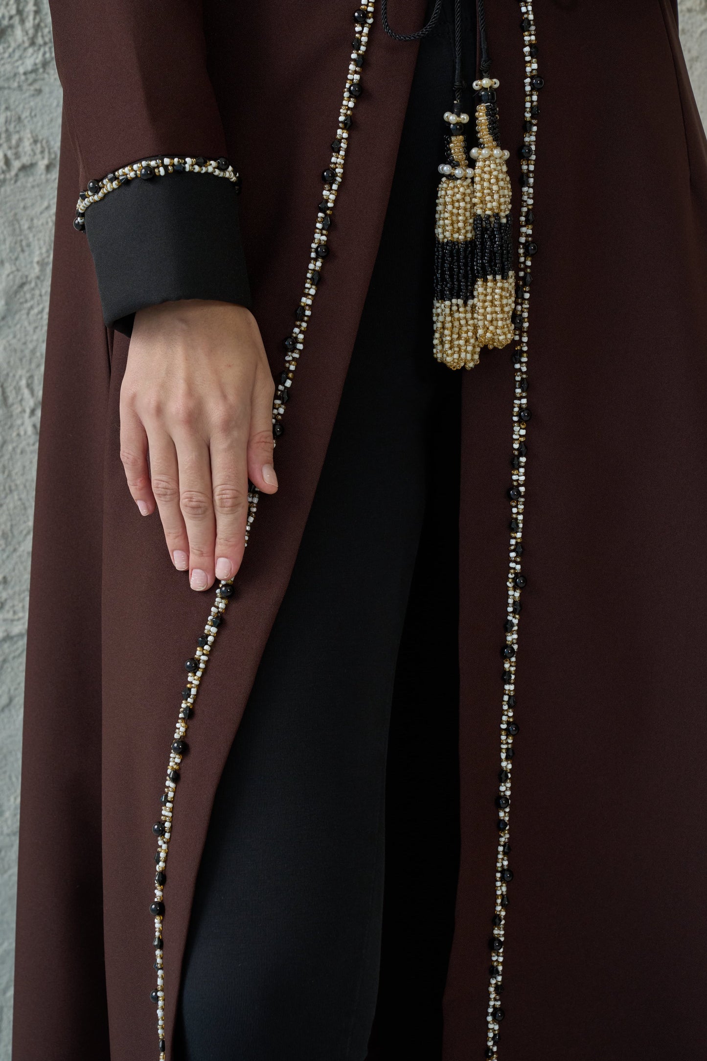 Our best-selling abaya features a contrasting color collar and tie-knot beaded tassels. Designed with timeless details, it's a versatile piece perfect for wearing all year long.